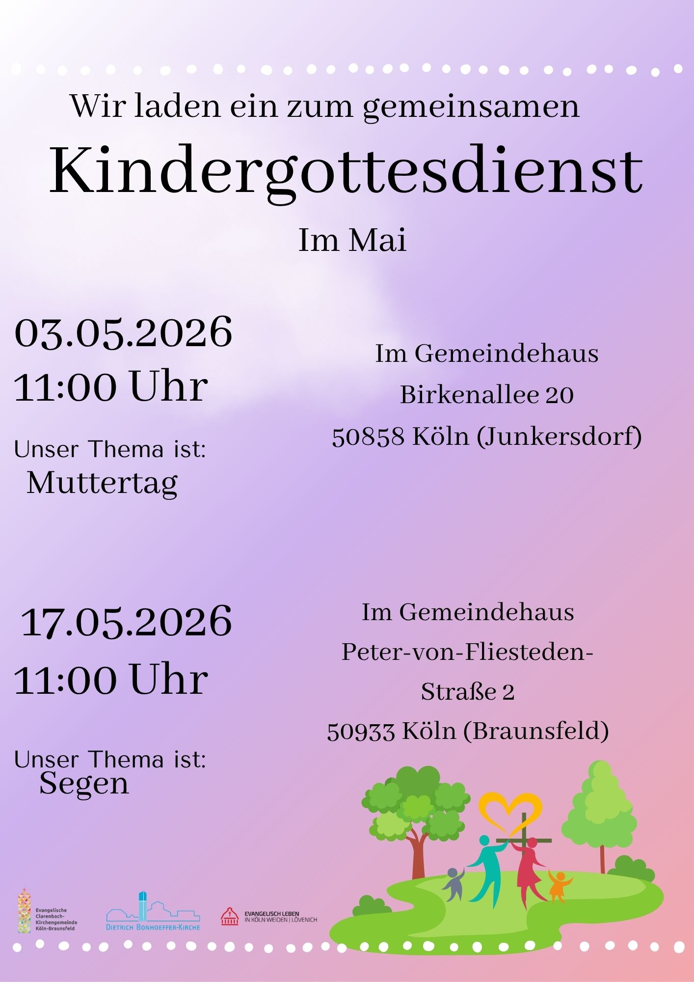 Zur evangelische Kirchengemeinde Junkersdorf gehört die evangelischen Kindertagesstätte in der Blumenallee (Träger ist die Diakonie Michaelshoven).