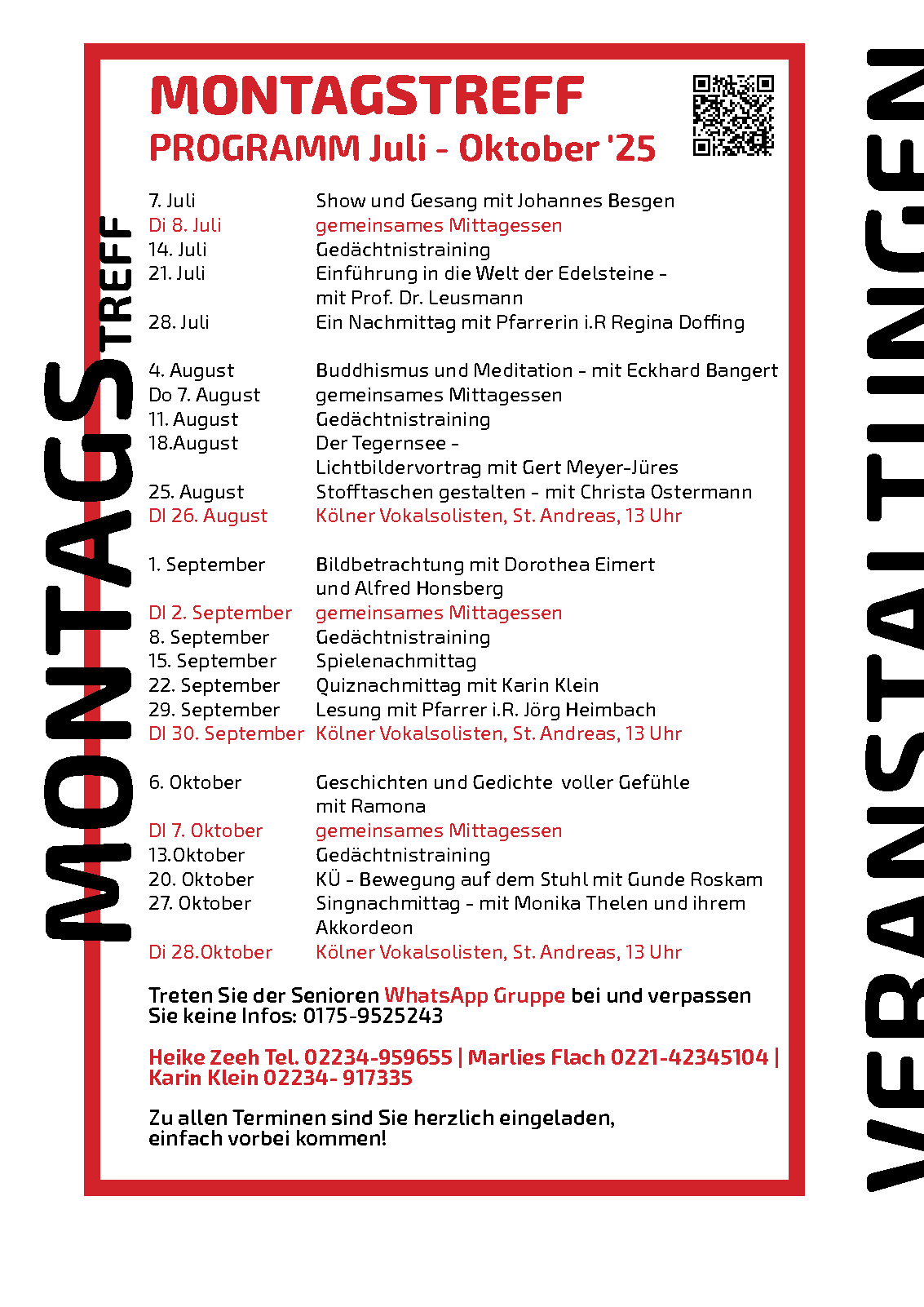 Beim MONTAGSTREFF (von 15.00 bis 17.00 Uh) haben Senior*innen die Gelegenheit – neben einer Tasse Kaffee und Kuchen - sich mit aktuellen Themen und interessanten Vorträgen zu beschäftigen, sich zu unterhalten oder etwas gemeinsam zu unternehmen.